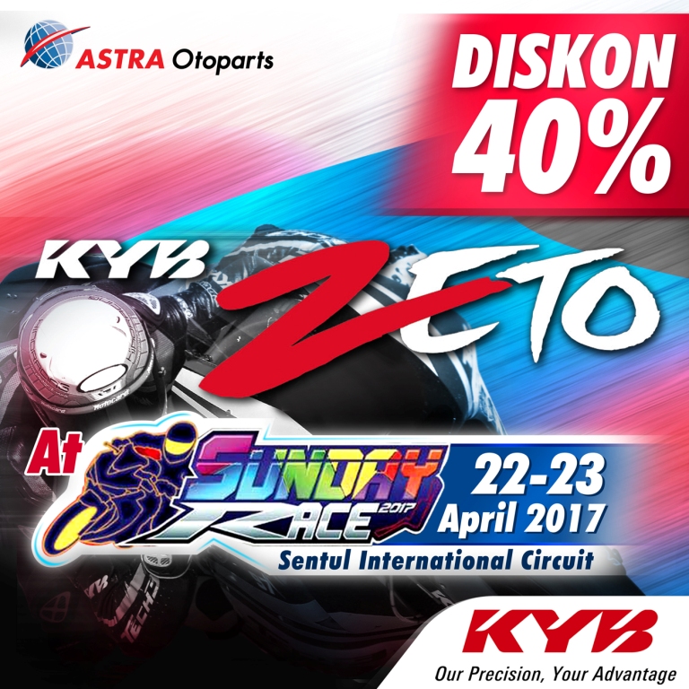 Ayo datang dan dapatkan diskon 40% untuk setiap pembelian produk KYB Zeto di even Yamaha Sunday Race bertempat di Sentul International Circuit tanggal 22 - 23 April 2017.